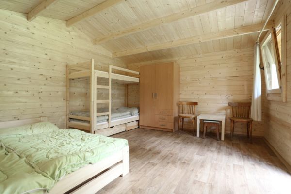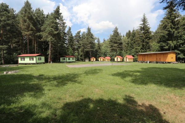 2 chaty (po 8 lůžkách). Malá chodba, dvě ložnice po 4 lůžkách, elektrika, sociální zařízení v areálu.